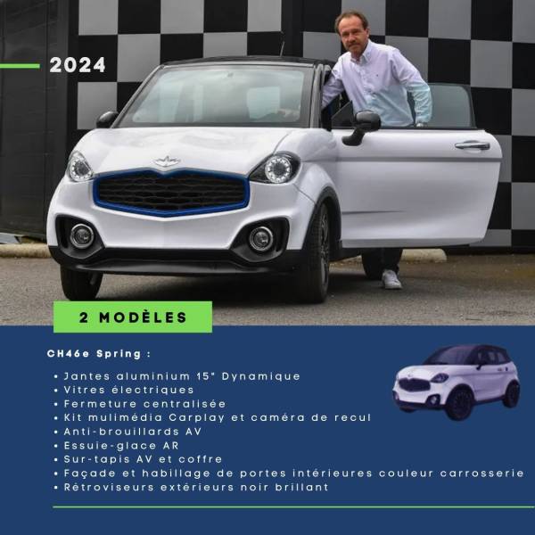 CH46e Spring : Jantes aluminium 15" Dynamique Vitres électriques Fermeture centralisée Kit mulimédia Carplay et caméra de recul Anti-brouillards AV Essuie-glace AR Sur-tapis AV et coffre Façade et habillage de portes intérieures couleur carrosserie Rétroviseurs extérieurs noir brillant.