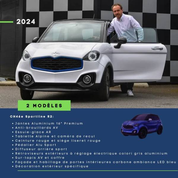 CH46e Sportline R2 : Jantes Aluminium 16" Premium Anti-brouillards AV Essuie-glace AR Tablette Alpine et caméra de recul Ceinture rouge et siège liseret rouge Pédalier Alu Sport Diffuseur arrière sport Rétroviseurs extérieurs à réglage électrique colori gris aluminium Sur-tapis AV et coffre Façade et habillage de portes intérieures carbone ambiance LED bleu Décoration extérieur spécifique.