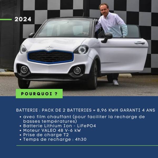 BATTERIE : PACK DE 2 BATTERIES = 8,96 KWH GARANTI 4 ANS avec film chauffant (pour faciliter la recharge de basses températures) Batterie Lithium Ion - LiFePO4 Moteur VALEO 48 V-6 kW Prise de charge T2 Temps de recharge : 4h30